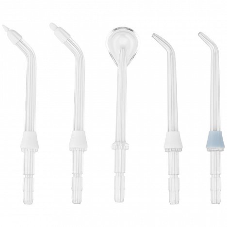 Насадки в комплекте: 2 стандартные струйные, 1 ортодонтическая, 1 пародонтологическая, 1 для языка