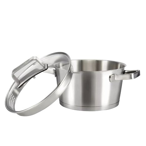 Крышка из жаропрочного стекла с отверстием для выпуска пара и специальным широким металлическим ободом с отверстиями для удобного слива жидкости.