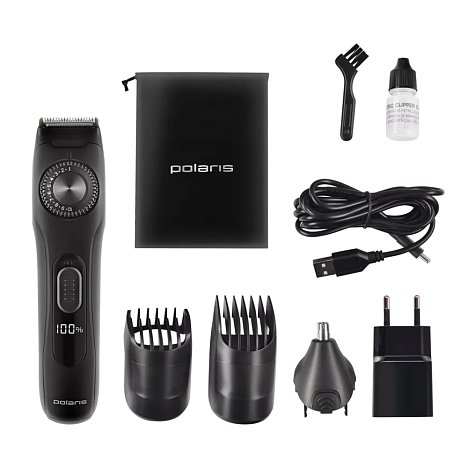 В комплекте: прибор, 2 съемных телескопических насадки, насадка для носа и ушей, адаптер, USB-кабель 1,8 м, масло для смазки режущего блока и щеточка для чистки, сумка для хранения.