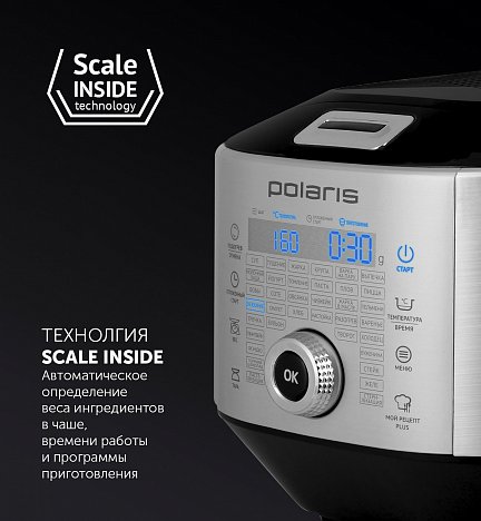 Scale inside Technology. Автоматическое определение веса ингредиентов в чаше, времени работы и программы приготовления.