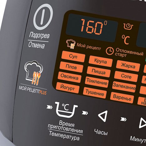 Режимы работы: Суп, Крупа, Жарка, Паста, Выпечка, Молочная каша, Плов, Пицца, Соте, Настойка, Сосиски/Пельмени, Разогрев, Овсянка, Томление, Запекание, Бобы, Холодец, Хлеб, Йогурт, Тушение, Варенье, Варка на пару, Компот, Стерилизация, Мой рецепт Plus.