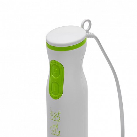 Блендер состоит из пластиковой ручки и съемной погружной насадки с металлическими острыми ножами. Их немного изогнутая форма обеспечивает качественное измельчение и перемешивание продуктов.