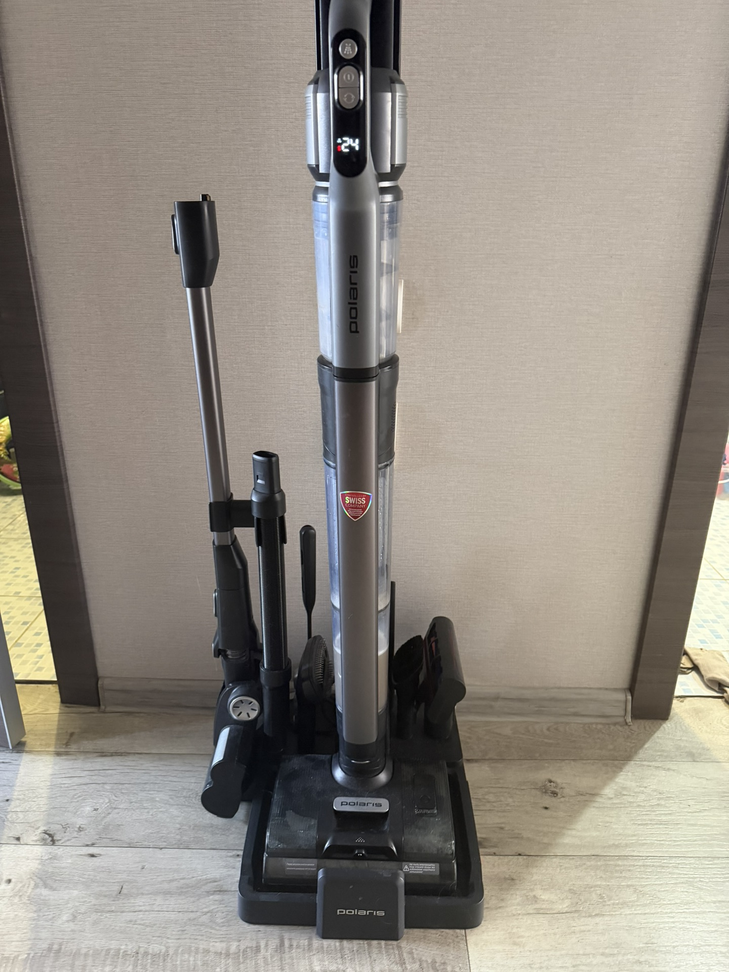 LED дисплей поможет контролировать статус уборки и заряд батареи. Напольная подставка одновременно является и зарядной станцией, и станцией самоочистки, также на ней компактно хранятся все аксессуары.