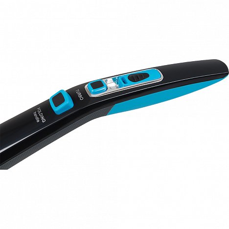 Ручка пылесоса складная. При нажатии на кнопку, она поднимается вверх под углом 90 градусов. Это позволяет пропылесосить под мебелью, не наклоняясь.