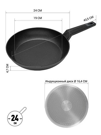 Антипригарная сковорода Polaris подходит для использования на индукционных, газовых, стеклокерамических и электрических плитах. Благодаря размеру 24 см на ней удобно приготовить вкусный стейк и другие блюда.